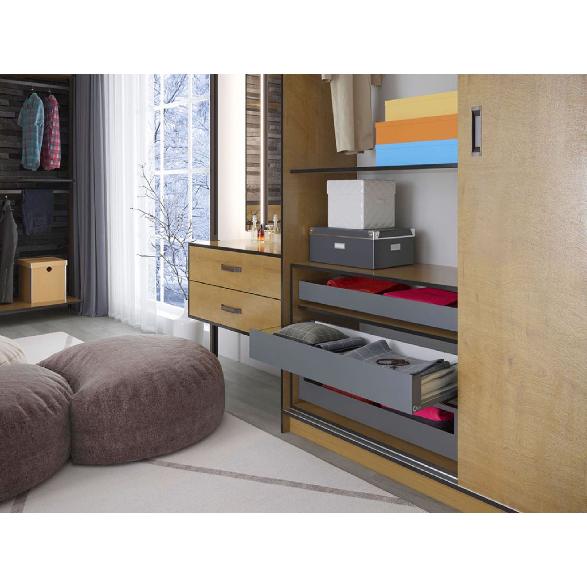 Внутренние ящики значительно расширяют возможные конструктивные решения при создании дизайна помещения с минимальным количеством фасадов. Возможно, как размещение одного внутреннего ящика за фасадом накладного фасада ящика, так и любое разумное количество ящиков за распашным фасадом на петлях. Теперь возможно создание т.н. шкафов-колонн.