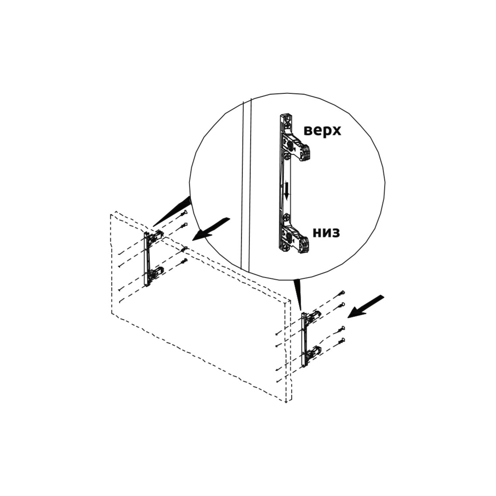 - Отверстие с регулирующими винтами расположено с внутренней стороны боковой стенки. Стальной механизм крепления спрятан внутри боковины, диапазон регулировок по вертикали и горизонтали позволяют достичь идеального расположения фасада и чёткой геометрии мебели.