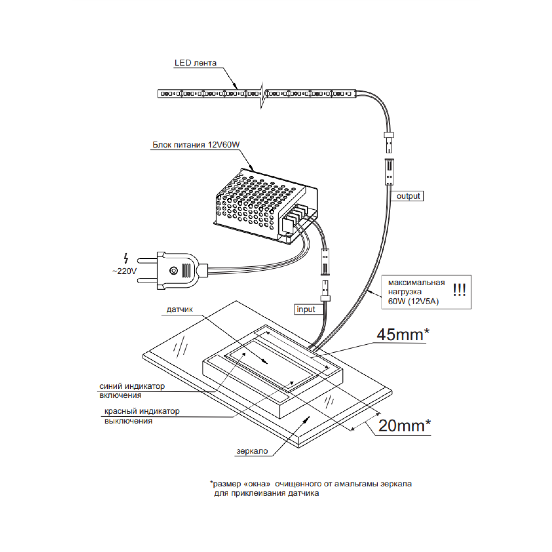 Перед встановленням вимикача необхідно видалити амальгаму з дзеркала, щоб просвічувати індикацію стану вимикача. Зона спрацьовування сенсора – 44*20 мм.